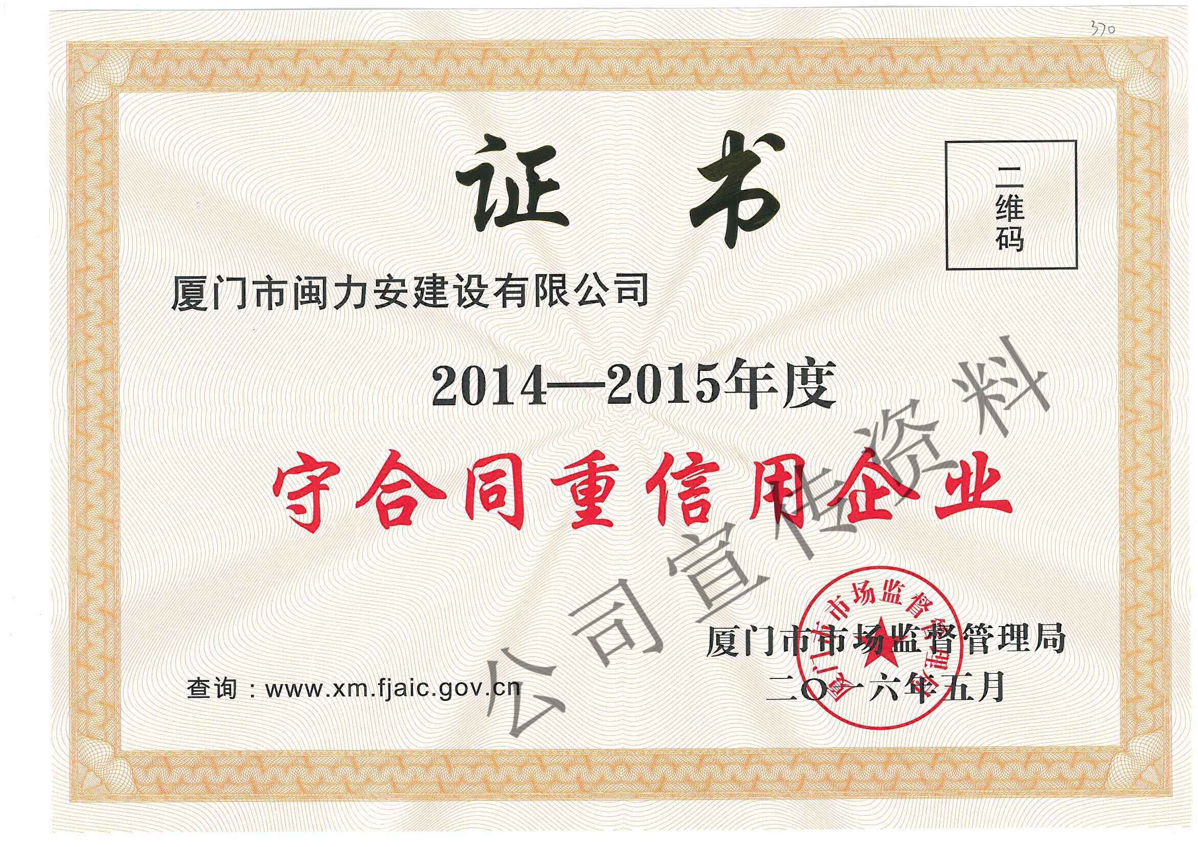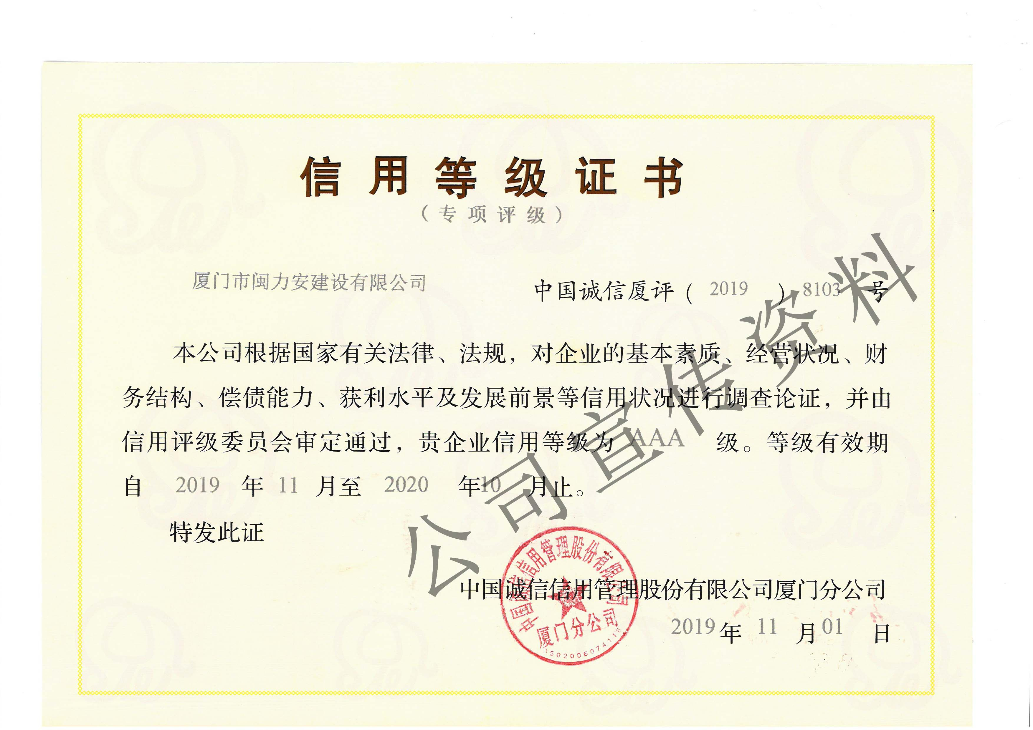 廈門市閩力安建設(shè)有限公司成立于2003年,公司取得市政公用工程施工總承包貳級(jí)、建筑裝修裝飾工程專業(yè)承包壹級(jí)、城市及道路照明工程專業(yè)承包壹級(jí)、電子與智能化工程專業(yè)承包貳級(jí)、消防設(shè)施工程專業(yè)承包貳級(jí)、電力工程施工總承包叁級(jí)、建筑機(jī)電安裝工程專業(yè)承包叁級(jí)、輸變電工程專業(yè)承包叁級(jí)、環(huán)保工程專業(yè)承包叁級(jí)、照明工程設(shè)計(jì)專項(xiàng)甲級(jí)、建筑裝飾工程設(shè)計(jì)乙級(jí)、施工勞務(wù)等資質(zhì)的綜合型企業(yè),公司于2013年通過了ISO9001質(zhì)量體系認(rèn)證,ISO14001環(huán)境管理體系認(rèn)證,OHSAS18001職業(yè)健康安全管理體系認(rèn)證。